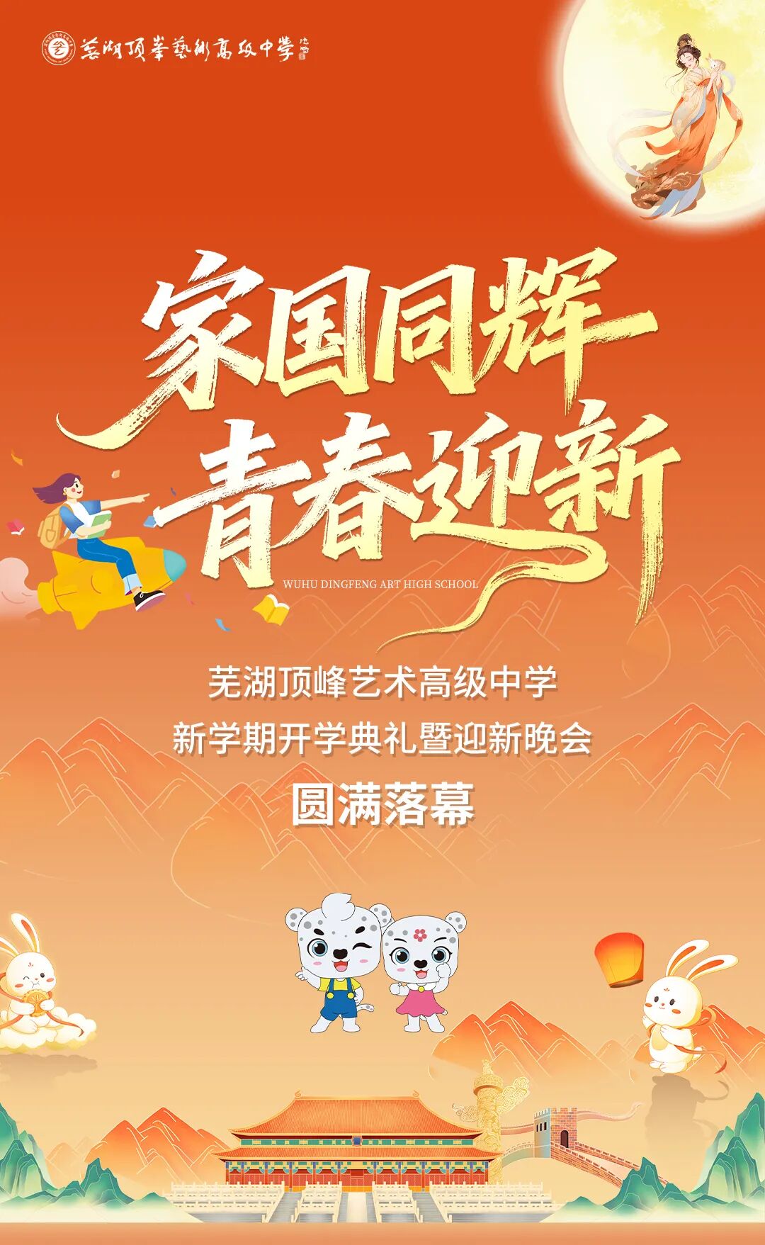 当“国”与“家”撞个满怀 当新生蓬勃朝气与顶峰迎新热潮交汇 我们心潮澎湃、共聚此时 这一天,不仅是“成长与热爱”的交融 更是“家国与青春”的回响  在开学典礼的国歌声中凝聚奋进力量 在主题迎新晚会以青春之姿告白祖国           9月21日下午,开学典礼在庄严的国歌声中拉开帷幕,铿锵旋律激荡爱国情怀。校领导、教师代表与新生代表相继发言,寄语新学期,凝聚奋进力量。典礼上对上一学年表现优异的学子进行表彰,以榜样之力激发全体师生追求卓越、勇攀“顶峰”的决心。                     一年月色最明夜,同心共贺家国安。9月21日晚芜湖顶峰艺术高中&芜湖中华艺术学校联合举办“庆国庆迎中秋迎新晚会”。两校师生欢聚一堂,以青春之名告白祖国、以热忱之心传递祝愿,祝福伟大的祖国国泰民安,祝愿每一个人月满心圆!             月光所至,皆为故乡 红旗所展,皆是信仰 青春所向,皆为梦想 愿所有顶峰人怀揣今日的热忱与感动 承爱国之心,立华夏之志,圆复兴之梦 以青春之笔,绘就新时代的壮美画卷