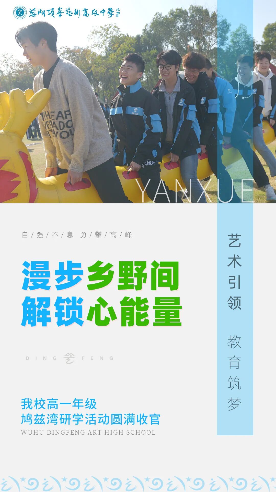 晴空万里,微风和畅。近日,我校高一年级的同学们,奔赴鸠兹湾的广阔天地,开展了一场以“漫步乡野间,解锁心能量”为主题的研学活动。这不仅是一次简单的外出,更是一堂行走的、充满艺术与生命力的成长必修课。 熔炼团队,在协作中凝聚集体魂 活动伊始,一系列精彩的团队拓展便迅速点燃了现场的氛围。从需要策略与默契的组队闯关游戏,到力量与呐喊交织的拔河比赛,再到考验专注与协调的扔飞盘竞技…… 每一个项目都不是个人的独秀,而是集体智慧的碰撞。同学们在欢笑与汗水中,深刻体会到了信任、沟通与协作的力量。一颗颗独立的心,在游戏的纽带中紧紧相连,凝聚成更具战斗力的班集体。 午餐的自助烧烤,老师和同学们围炉协作,一同烤肉、分享美食。炊烟袅袅间,是课堂之外平等愉快的交流,是师生情谊的升温。 餐后的自由时光,更是成为了同学们展示才艺的舞台。他们自信地走上户外舞台即兴舞蹈,将田野变成了充满青春活力的艺术现场。这一刻,学习压力得以释放,身心在美食与艺术中得到最深切的滋养。 作为艺术学子,感知力是创作的源泉。本次研学项目中的“乡野徒步”环节,正是对感知力的一次深度训练。同学们漫步于乡间小道,用眼睛捕捉斑斓的色彩,用耳朵聆听自然的声音,用呼吸感受泥土的芬芳。 随后乘坐的田园小火车,则以一种轻松浪漫的方式,将自然画卷徐徐展开。这场与大自然的亲密对话,无疑为同学们未来的艺术创作,积累了最鲜活、最生动的素材。 萌宠互动区里,充满了同学们的欢声笑语。有的同学细心投喂小动物,眼神里满是温柔与关爱;有的同学则举起手机,认真记录下这些可爱的瞬间。 这不仅是简单的娱乐,更是一堂生动的生命教育课。在与小动物的互动中,同学们学会了观察、尊重与爱护,内心深处的善良与责任感被悄然唤醒。 活动的点睛之笔,来自学校创始人夏云兴的深情讲话。他阐述了艺术在未来社会的重要性,鼓励同学们坚定自己的艺术选择。同时,他也特别强调了 “学会放松,享受学习与生活” 的平衡之道。 这番话语如春风化雨,照亮了同学们前行的方向,让大家深刻理解:一张一弛,方能行稳致远;热爱生活,才是艺术不竭的动力。 夕阳西下,满载着收获与欢笑,本次研学活动圆满落幕。我们相信,这次鸠兹湾之行所解锁的“心能量”——团队的凝聚力、身心的松弛感、自然的灵感、思想的启悟与生命的仁爱,必将内化为同学们成长的新动力。 心之所向,步履以往。愿每一位顶峰学子,都能怀揣这份乡野间收获的能量与感动,在未来的艺术道路上坚定前行,勇敢探索,终有一日,于顶峰相见,各自成峰!