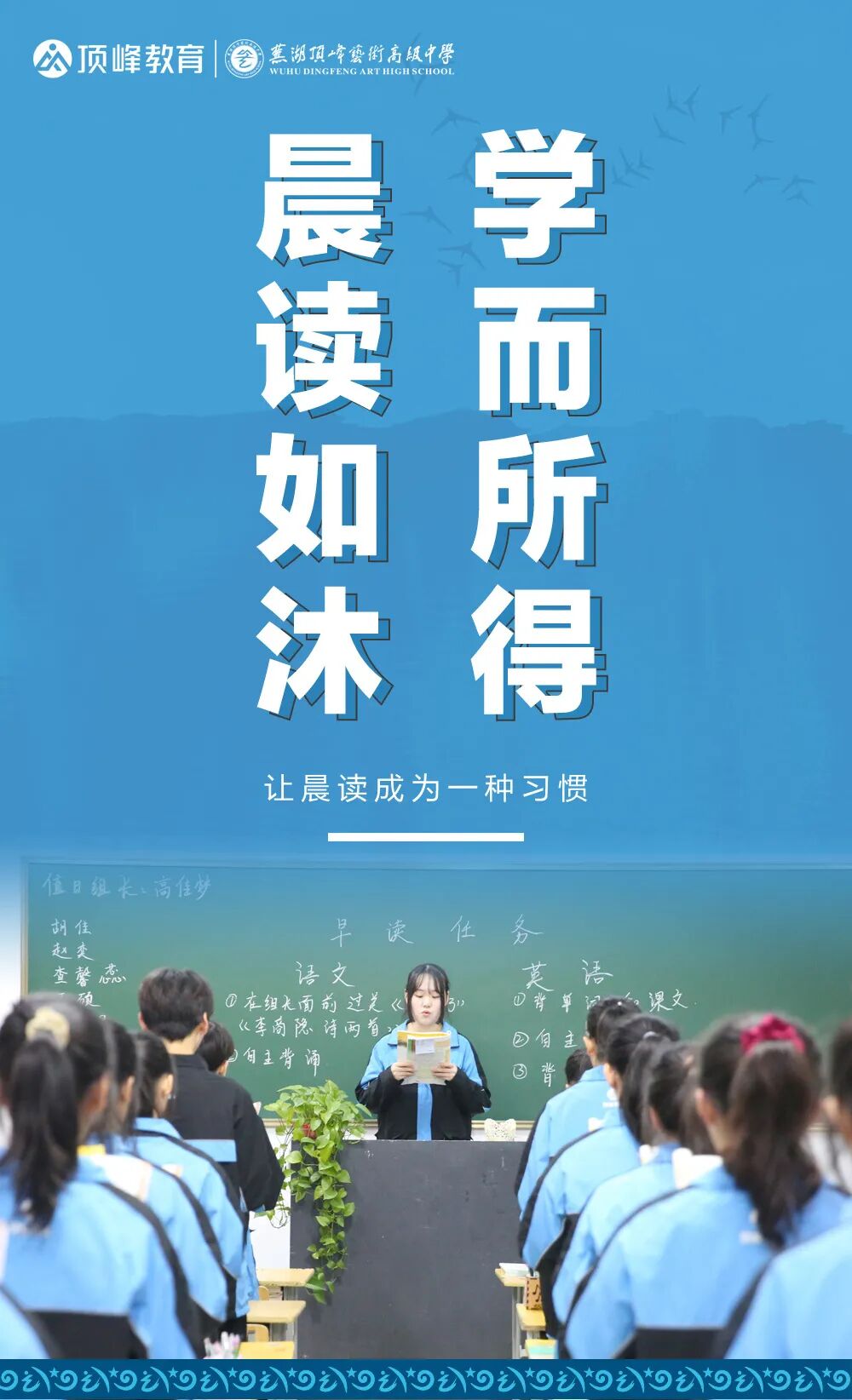 充分利用早晨的时间 让学生多读书是大有益处 既能训练学生的朗读技巧 提高学生读的素质 又能使学生积累更多的知识 而且高中生正处于记忆力较好 能储存大量知识的阶段 所以,充分利用好晨读尤为重要 每天30分钟的晨读 带给学生的不只是阅读能力 发现书本文字中潜藏的诗情画意 提升自身品格修养更为关键 让晨读成为一种习惯 让阅读融入我们的生活 这也是顶峰艺术高级中学六项校本其 一—— 养成教育 晨读是希望的开始 它让我们更有活力和朝气 晨读时 我们专心致志,心无旁骛 晨读时我们声音不仅洪亮 更是一种精神 以及克服艰难的决心 力学如力耕,勤惰尔自知