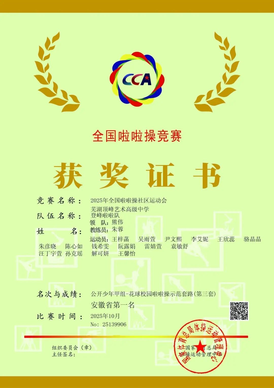 在2025年全国啦啦操社区运动会比赛中,芜湖顶峰艺术高中啦啦操队的队员们以动感的舞姿与默契的配合,尽情释放青春激情,最终斩获公开少年甲组——花球校园啦啦操示范套路(第三套)芜湖市第一名、安徽省第一名,并荣获全国“优胜奖”的优异成绩。 本次比赛由国家体育总局体操运动管理中心、中国蹦床与技巧协会主办,江苏省啦啦操运动协会、南京市鼓楼区文化和旅游局(体育局)承办。 本次比赛在领队熊伟老师与教练员朱蓉老师的带领下,16名运动员以团结一心的意志与全力以赴的姿态,共同为学校赢得了这份荣誉。此次夺冠,不仅是顶峰师生凝聚力与向心力的生动写照,更是我校艺术特色教育实践成果的一次精彩展示。     荣誉的背后,是师生日夜不辍的反复打磨。日常训练中,同学们白天专注学业,晚间则投入系统训练,做到了“学业不松、训练不怠”。踏上赛场时,每一个动作都娴熟精准、每一段节奏都张弛有度,16 个跃动身影彰显出团结协作、自强不息的精神风貌。       青春展风采,自信昂扬 突破显可能,未来可期 愿顶峰学子带着这份荣耀再启新程 怀揣为共同目标拼搏的坚定信念 在更大的舞台上绽放光彩 续写属于自己的灿烂篇
